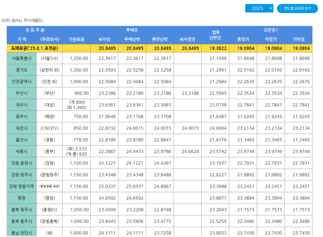 ※ 단가는 지역, 계절, 용도별로 달라질 수 있으므로 반드시 해당 지역 도시가스사 홈페이지 요금표를 참고해야 합니다.