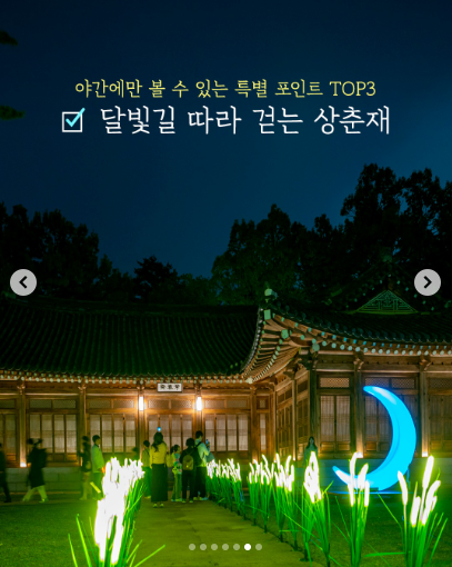 | 봄 | 벚꽃길, 상춘재 뒤편 정원 | 전통 정원과 궁궐식 꽃길 감상에 최적 |